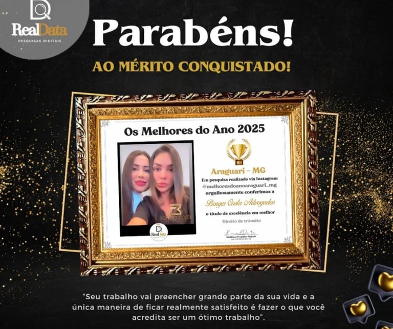 O compromisso das Doutoras com a justiça e a defesa dos direitos no trânsito foi mais uma vez reconhecido. Em pesquisa pública realizada pela Real Data Pesquisas Digitais, a advogada recebeu o prêmio “Os Melhores do Ano 2025”, conquistando o título de Excelência em Direito de Trânsito na cidade de Araguari – MG.